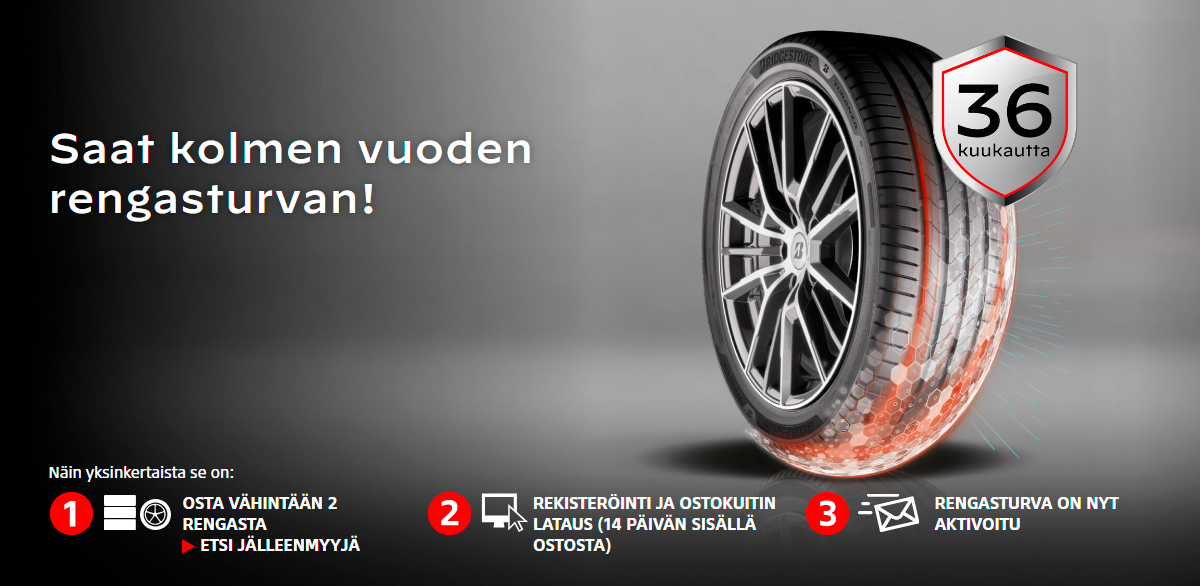 Bridgestone tarjoaa loppuasiakkaalle maksuttoman Bridgestone-rengasturvan 36 kuukaudeksi ostaessaan vähintään kaksi uutta Bridgestone-rengasta henkilöautolle, SUV/4x4:lle tai pakettiautoille missä tahansa koossa.